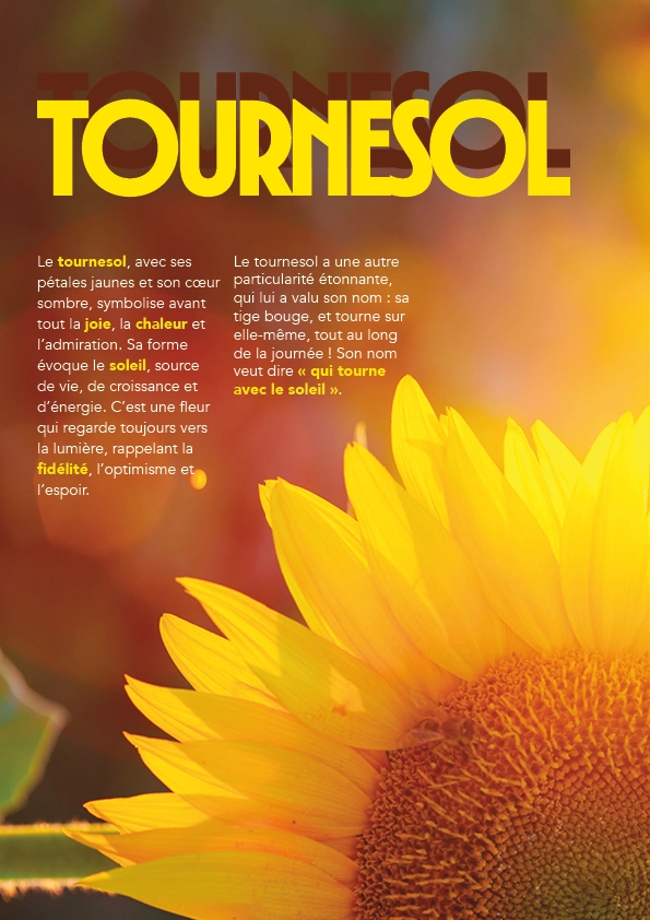 Ces affiches représentent la fleur de tiaré et le tournesol qui sont mes fleurs préféres. La fleur de tiaré est symbole de pureté et le tournesol de joie qui est toujours tourné vers le soleil. Elles reflètent une part de ma personnalité.